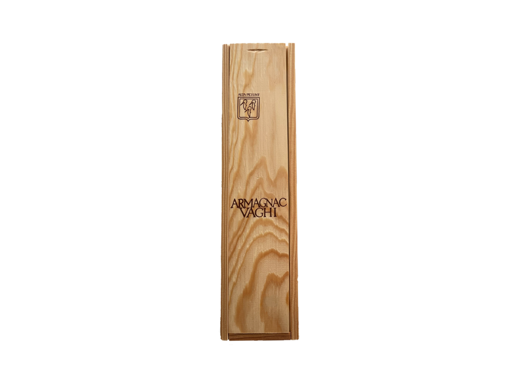 Dárkový box z borovicového dřeva s posuvným víkem na 1 láhev Armagnac Vaghi o objemu 0,7 l.